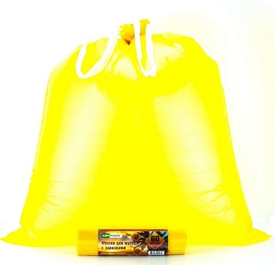 Пакеты для мусора с завязками 60 литров, 18 мкм, 10 шт. ПНД, желтые, + ленты для затягивания